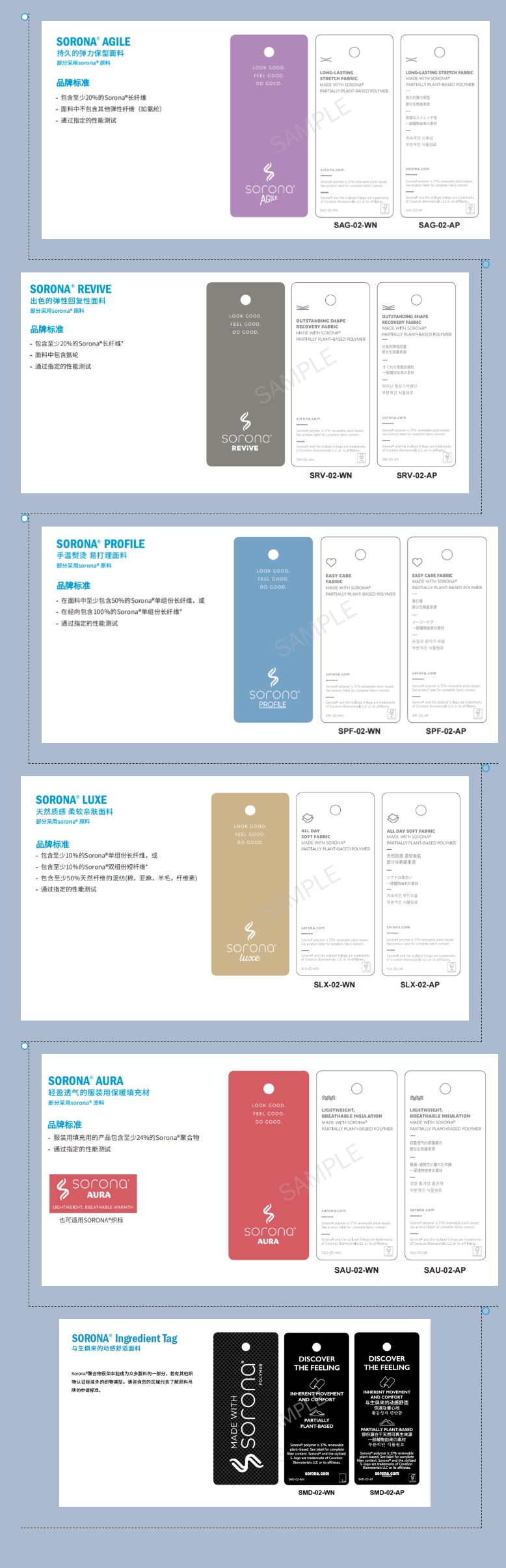 随着SORONA®业务转移至Covation Biomaterials 瑞讯生物材料公司成为全球率先、提供生物基解决方案的生物材料公司,借此机会,SORONA®全球团队对吊牌的设计进行了全方位更新和升级,包含细微的措辞更改。