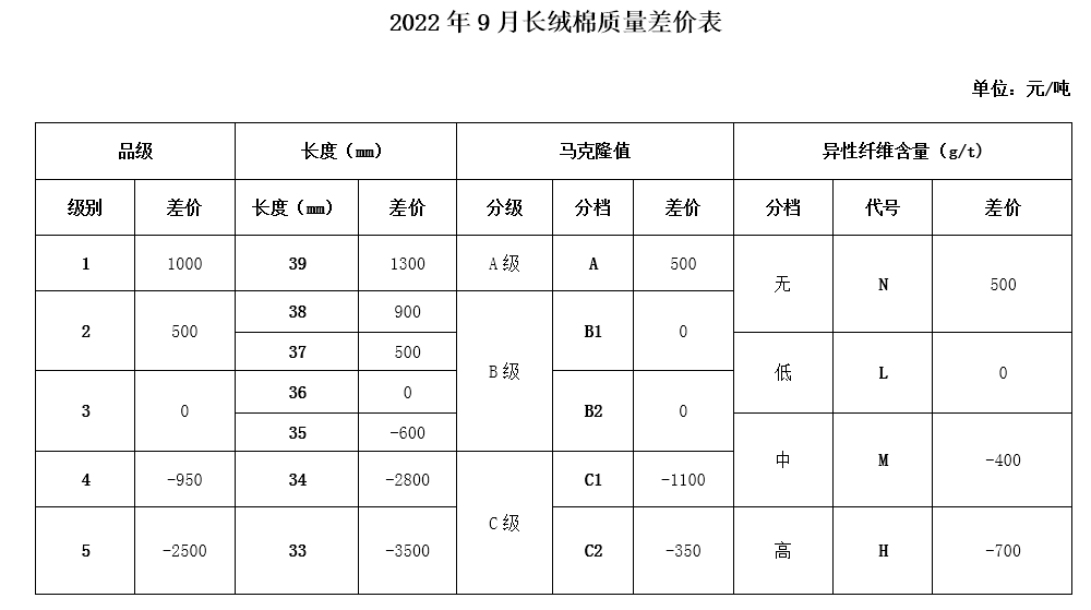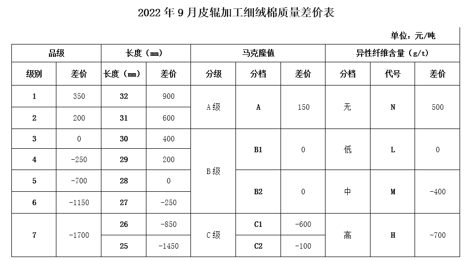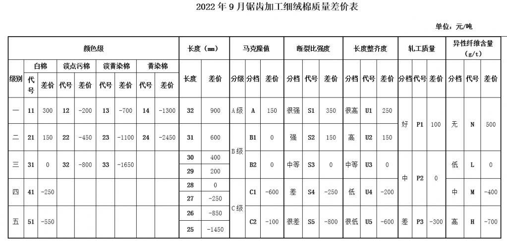 9月进入棉花收获季,新棉大规模采摘交售即将开始,为引导籽棉机采前打脱叶剂时间和采摘时机的合理控制,保证采收籽棉的品质,并征求业内相关专家的意见,现对2022年9月《中国棉花协会国产棉质量差价表》做出如下调整: