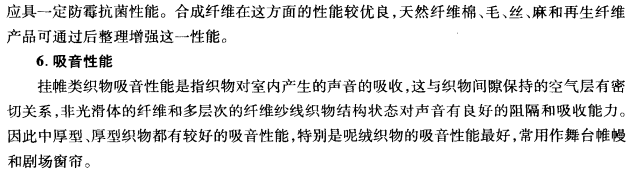 挂帷类织物具有遮蔽、调节、隔离等实用功能,其使用特点是悬挂使用和界于室内与室外之间,基于此,这类织物必须具有以下一些独特性能: