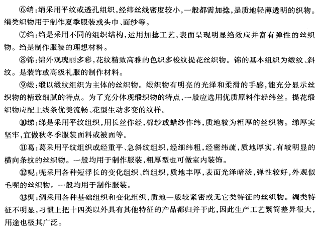 ⑤纺;纺采用平纹组织,经纬一般不加捻,是表面细洁缜密的丝织物。纺也叫纺绸。是丝织物中生产工艺为简单的一种。适宜作普遍夏季服装的面料及高级套装的里料和肥料。
