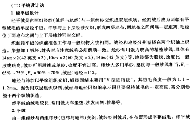 织制经平绒时,因为单层起毛杆织制法的生产效率低,所以,一般都用双层织制法。平绒织物与灯芯绒织物的性能相似,只是形成绒毛的系统及特征不相同。
