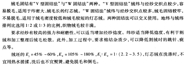 灯芯绒的组织可以采用平纹、斜纹或纬重平组织。当平纹为地组织时,割绒方便,织物断裂强度大,交织点多,也使纬纱密度受到限制,成品手感较硬,织物背部受到摩擦时容易脱毛。目前,生产多用平纹变化组织,有单经保护层和双经保护层两种,不仅可以改善脱毛现象而且可以不增加纬密,而只需适当增加Pj。以斜纹为地组织,交织点较少,Pw可以增加,成员手感柔软,但织物正面易发生脱绒。斜纹地组织常用于织制较厚实而柔软、毛绒紧密的灯芯绒。