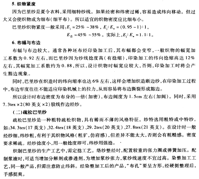 巴里纱原料采用纯棉、涤/棉、涤/富等。其中以涤/棉为65/35混纺比居多。涤/棉巴里纱除具有—般巴里纱的特征之外,还具有不易折皱、易洗快干、挺爽等特点。