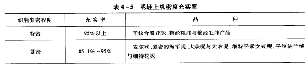 粗纺产品充实率指的是呢坯的上机密度与大上机密度的比值。用来反映纱线在呢坯中的充满程度,并可比较不同组织的织物织造难易程度和紧密程度。上述紧度只能表示相同组织织物的紧密程度,而不能将不同组织的织物进行比较,因为不同的组织具有不同的大密度。在织物设计时,一般根据品种要求选样充实率,再根据计算出的大密度求出上机密度。