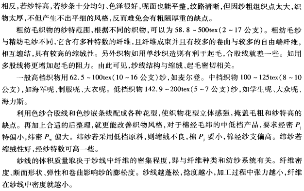 一般来说,通常高特纱用以织制厚家织物。但是高档精纺织物,有的也用低特纱,通过复杂的二重或双层组织使织物紧密,厚重。