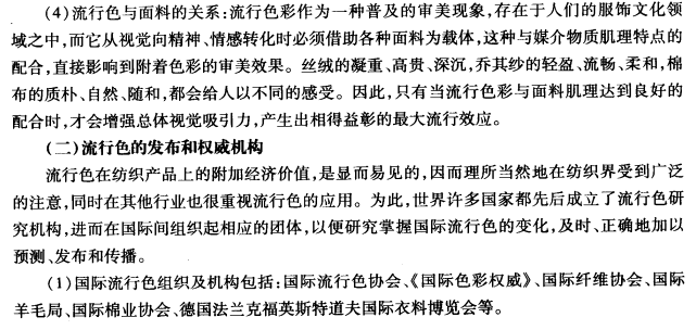 (3)不同档次面料的区别:按照不同消费层次与要求,一般把面料分成高、较高、中、低四个档次。高档的全毛及部分真丝面料大部分做礼服.穿着周期较长,销售面较窄,销量也较少。相反.某些低档的纯棉面料,销售面虽广,但大路货居多,这些面料对流行色的反映不太敏感.较多选用常用色。较高档和中档的混纺呢绒、涤棉及部分丝绸、纯棉面料,大多属时装类面料,是流行色应用的主要产品,因此,应将它们作为重点调研、生产的对象。