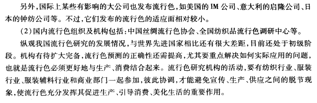 (2)不同地区的区别:国际流行色对世界各国的而料市场有着明显的指导作用,其影响是宏观性的。但对于不同国家及地区而言,则相对会有许多变化,流行时间的先后、长短也有差别,而现代交通、通讯、贸易的发展。又会反过来冲击国际色彩潮流的趋向。