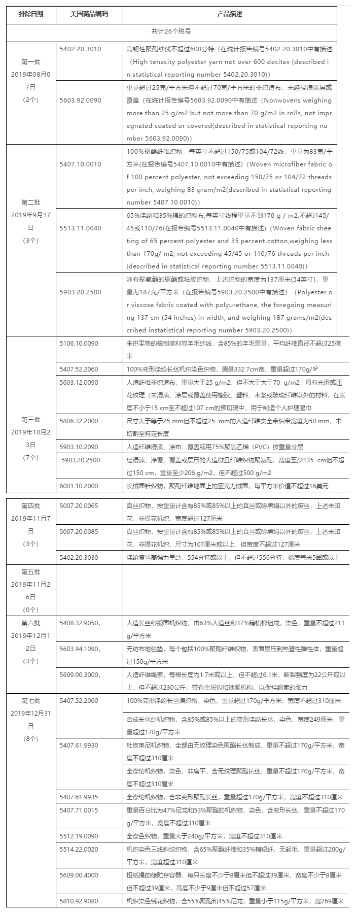 2000亿美元征税产品排除清单中纺织服装产品排除汇总表