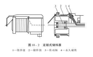 如图10-1所示的动鼓式储纬器的外观和纱线卷绕方式。卷绕时,储纱鼓作螺旋摆动,把张力器1送出的纱线卷绕到储纱鼓2上。为了进行正常卷绕,纱线的引出端必须握持在转动的鼓面上,退绕时,在毛刷环3的作用下,纱线只沿鼓面滑动,其张力比较均匀。但毛刷环受纱线强烈摩擦,容易损坏。运转中要注意毛刷环与纬纱捻向的配合。