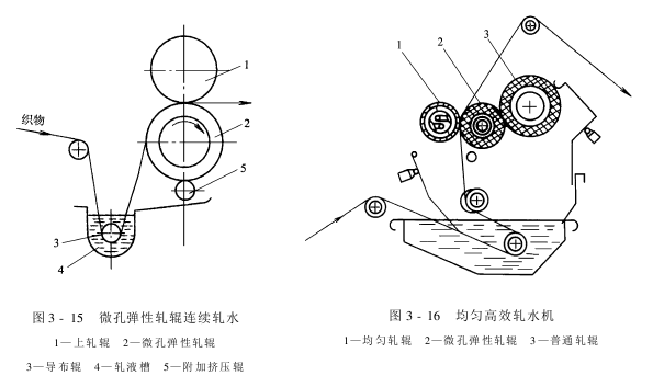 上述几种轧水机都是依靠轧车的轧压作用,把水分从织物中排除。这种轧压作用能排除的大部分是织物表面的水分,至于纤维或纱线空隙中的水分,则只能排除小部分。因此,单纯靠增大轧点压强来降低轧余率是有限度的。为了进一步提高轧水效率,出现了使用吸或吹的方法来排除更多水分的新型轧辊和轧车,这就是微孔弹性轧辊和压缩空气喷射式轧车。