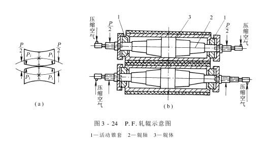 图3-23所示的是德国Artos公司研制的Artos轧辊。其下轧辊是一般轧辊,上轧辊即所谓Artos辊,是一种两端加压的中固轧辊。在中固轧辊的辊体与辊轴两端,设置了8个加压点。通过调节这8个压力参数,来调节轧辊的压力与挠度,能达到提高轧液均匀度的效果。这种轧辊在宽幅轧车上使用效果也较好。但其结构复杂,操作与维修都比较麻烦。 图3-24所示的P.F.轧辊,是由日本创造的。上、下轧辊为同一结构。一对中固轧辊,在加压后弯曲变形,形成线压力中间大、两端小的状况,如图3-24(a)所示。在辊体两端内侧各装一套附加加压装置,如图3-24(b)所示。它由安装在辊体两端内孔中的锥形套筒与可在辊轴上沿轴向滑移的锥形块组成。从辊轴轴头中央孔通入的压缩空气,能使锥形推块沿轴向向辊体内挪移。其锥形面压向锥形套的内侧面产生一横向的附加压力,改变了辊体端部的变形。调节压缩空气的压力,就可调节横向矫正变形的附加压力,和轧压压力相适应。锥形推块与套筒的锥度不能大,否则,横向矫正就小;但也不能太小,因要产生自锁,普通取10°左右。