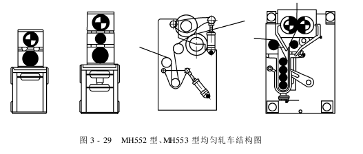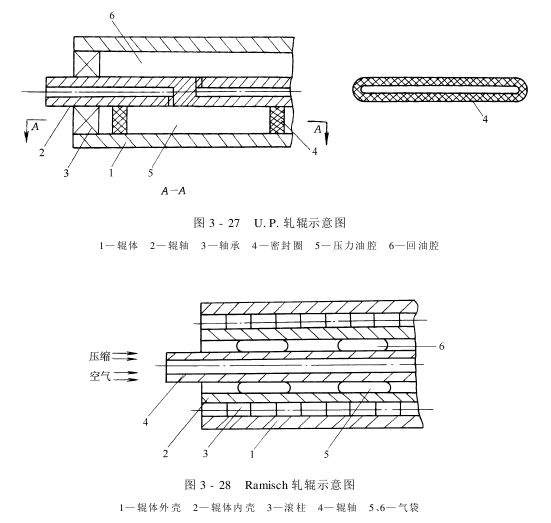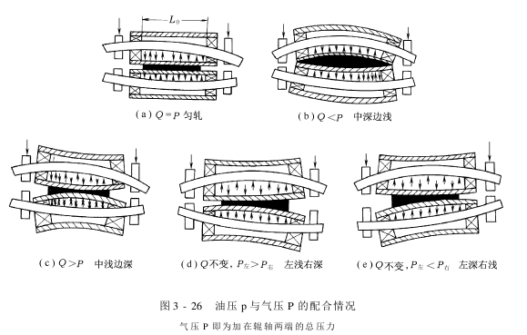 即这种轧辊的线压力,只和辊体内径与压力室油压相关,而和工作幅度无关。这为设计各种阔幅与特阔幅轧车提供了新的理论依据。 Küsters轧辊不仅能产生很好的匀轧效果,而且,通过调节内腔油压力p,可使辊体内壁承受的总压力改变,取得各种不匀轧效果,以适应各种特殊工艺的要求,如图3-26所示。