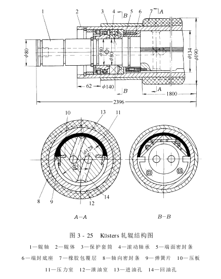 其实,这种轧辊的基本原理和Artos轧辊相似,都是通过加在辊体两端的反向力矩来平衡轧辊两端工作压力产生的弯矩,减小轧辊的变形。但P.F.轧辊的结构容易,操作与维修也方便。 从理论上说,这两种轧辊并没有从根本上解决轧液均匀度的问题,只是有所改善而已。但从实际效果瞧,基本上能满足目前工艺要求。 德国Küsters公司根据增添支点的原理,于1955年研制出世界上台均匀轧车。此种轧车获得了相当的轧液均匀度,被公认为是理想的上色轧车。 一般轧车轧辊的辊体外壁,受一均匀分布载荷,支点在辊轴两端,因此产生了肯定的挠度。 假如辊轴的支点增多,挠度必将减小;当支点增添至无穷多时,挠度将变为零。根据这种构思,在辊体内腔通入具有肯定压力的液体或气体,对辊体内壁形成和外壁载荷相平衡的均布力(好似无穷个支点),辊体的挠度就变为零。 图3-25是德国Küsters轧辊的结构图。辊体安装在轴承上,绕固定不动的辊轴转动。辊轴与辊体之间的空腔,由端面密封条与轴向密封条分隔为两室。在轧点一侧的半环形空腔,称为压力室;在轧点另一侧的半环形空腔,称为泄油室。压力油由轴端上的进油孔进入压力室。泄漏入泄油室的油则经轴上的归油孔流归油箱。 设辊体内径为d,工作幅度为l,进入压力室的油的压力为p,则辊体内壁承受的总压力为: