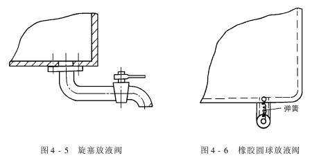 圆锥盘放液阀的材料,可根据工艺要求而定。如冷热水槽,可采纳HT20—40或ZH62材料;碱性液槽,可用HT20—40材料;酸性液槽,可用ZH62材料;不锈钢制的水槽,其圆锥盘放液阀的阀座材料采纳不锈钢,其阀芯材料可采纳橡胶,这样可预防渗漏。 圆锥盘放液阀的配合锥度常取1∶1.2(1∶1.0或1∶1.5均可),加工后需用研磨砂研磨,圆锥表面不得有气孔或砂眼,并做渗水试验,要求不漏。 (2)旋塞放液阀:如图4-5所示,普通为铸铁制成,其配合锥度为1∶7,光洁度及技术要求和圆锥放液阀相同。 (3)橡胶圆球放液阀:它用于不锈钢水槽,如图4-6所示。在不锈钢槽的出液口,置一个软橡胶球,球的外径应比出液口内径大些,圆球两端和出液管上均有圆柱销钉,销钉间装两根不锈钢拉簧,以弹簧拉力将圆球紧紧阻塞放液口。放液时,操作人员将圆球拉离放液口即可。这种结构适用于冷水或温水槽。各种放液阀的分析对照见表4-3。