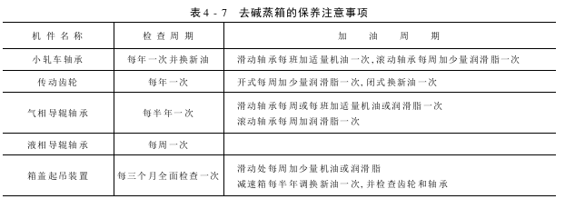 去碱蒸箱的维修与保养小心事项分离见表4-6与表4-7。
