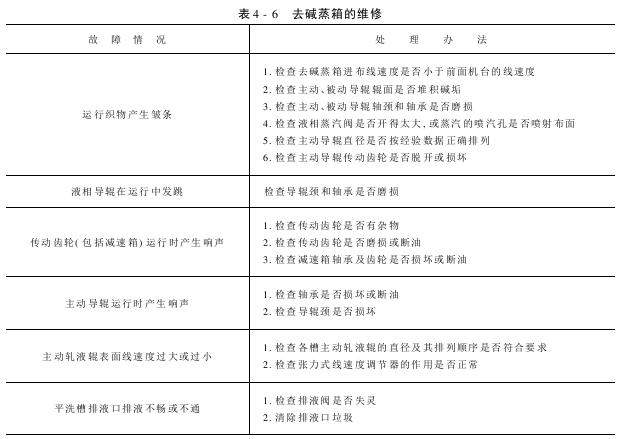 ①面料横穿、洗液逆流:面料自槽底进入洗槽后,在导辊间由下而上横穿运行。用泵将出口处污物浓度低的洗液,经汽水混合器加热后,赠往浸渍槽中冲洗,并以逆流方式流经各层面料。由于横穿运行的面料在导辊间多次改变运行方向,致使自槽顶向下冲洗逆流的洗液,借其贯流作用,能反复多次地从正反两面透过面料,有利于洗液充分逆流与面料上洗液交换,耗水少、净洗效率高。 ②常压液封热洗:洗槽基本密封,面料进口采纳水封。除用汽水混合器加热冲洗的洗液外,在洗槽底部有直接蒸汽管加热。槽内洗液可接近常压下沸点水温。 ③多浸多轧:槽内除装有小型浸渍槽与轧辊外,实际上,每根导布辊与防皱弯辊都有肯定的挤液作用,故布料是在多浸多轧与洗液清浊分流的情况下净洗的。 ④低水位、小浴比:洗槽底部的大洗液槽液面高度仅230mm,容量较小;小浸渍槽的容量则更小。因此,洗液更新快,有利于布料上的污染杂质向洗液扩散。 由此可见,一台高效平洗机,往往是多方面综合考虑后改进设计的。 平洗机的普通维护保养与常见故障处理见表4-4与表4-5。