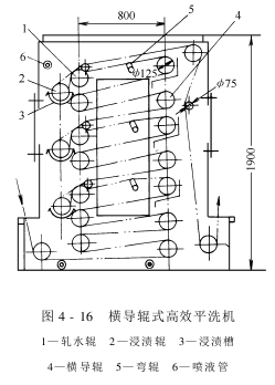 (1)常压液封热洗:顶盖口沿水封,进出布处由洗液封口,槽内温度高可达98℃。布料在汽域中运行时间较长,这种蒸洗对洗碱、洗色酚及洗活性染料等效果极为显著。采纳性能较好的汽水混合器,槽外加进热水(热水喷于进轧辊组轧点前的面料上),槽内加热保温的办法,耗汽少,槽内温度稳定,面料不易起皱。 (2)逆流低水位:除相邻洗槽间洗液逆流外,槽内还分格迂归逆流。同时,由于低水位、小浴比,洗液更换快,利用充分,且有利于布料上的污物向洗液扩散,耗水、耗汽少。 (3)多浸多轧:槽内每根上导辊上斜装一根直径为30mm的耐热合成橡胶压辊,借自重加压,使布料多浸多轧。 (4)低频振荡:每槽被动下导辊的中间四根为四角导布辊(即波形辊),能使面料产生低频振荡,并搅动洗液,促使面料上的洗液快速交换。 图4-16所示为横导辊式高效平洗机,它的结构特点如下: