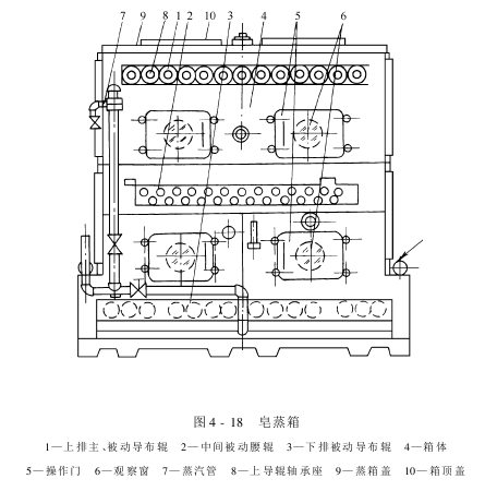 图4-19所示为长蒸箱,除可皂蒸、热蒸外,也可碱蒸。箱中装有上下两排导布辊,上排9根,奇数为主动辊,均由力矩电动机单独驱动。下排10根,均为被动导辊。