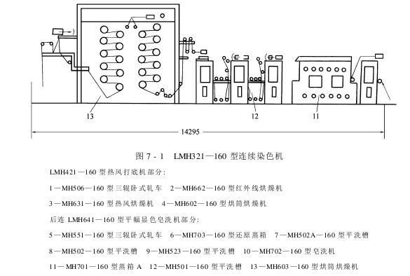 延续轧染机是能适应多种染料不同工艺要求延续轧染的一类平幅上色联合机。这类设备适用性强,可一机多用,生产效率高,产品质量好,操作维修较方便,是较为理想的上色设备。这种设备的种类较多,组成各有差异,但其主要组成单元机不外乎以下几种:平幅进布装置、平幅浸轧机、红外线烘燥机、热风烘燥机、汽蒸箱、焙烘机、平幅水洗机与烘筒烘燥机等。在选择时,可根据不同的工艺要求,设计出不同组合的轧染联合机。图7-1所示LMH321—160型延续上色机就是其中的一种。此机可供棉及棉型布料等进行活性染料、还原染料、不溶性偶氮染料等的延续轧染,也可进行普通不需汽蒸的可溶性还原染料的延续轧染。