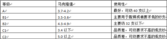 纤维长度分级: 2、马克隆值 棉纤维的马克隆值是纤维细度与成熟度的综合反映。棉纤维的马克隆值可作为评价棉纤维内在品质的一个综合指标,直接影响纤维的色泽、强力、细度、天然性、弹性、吸湿、上色等。