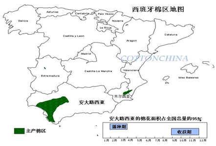1、希腊南部:忒拜、利瓦迪亚、拉米亚等地 2、希腊中部:塞萨利、特里卡拉、咔迪察 3、希腊北部各省 希腊平均每年播种的棉田面积为36万到40万公顷,皮棉年平均产量介于37万至41万吨。 希腊是世界上唯一生产高地中纤维棉的国家,不产长绒棉,而短绒棉的短长度为27.8mm。 通常情况下,希腊棉花年产量的65%到70%的色级为21-31(即美棉国际通用棉花标准的白色),长度为1-3/32”到1-5/32”,马克隆值(Micronaire)为3.6至4.5,强力28.5至30.5GPT。 希腊棉花生长靠灌溉,品级普遍高于美国,棉花皎洁, 机采,无三丝,不含糖,可纺性好 二、西班牙