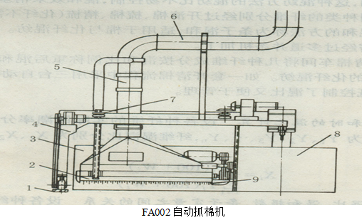 A)抓棉机分类: ①按抓棉方式分: a)上抓式:打手从棉包上面抓取棉块,国内机均属此型。 b)下抓式:棉包放在上面,抓取机件从棉包底部抓取棉块的方式。 ②按抓棉小车运行方式分: a)环行式:作环行休闲,如FA002。 b)往复直行式:作往复直线休闲,如FA006, FA009、A1/2等。 一、抓棉机机构与作用 (一)FA002型系列与FA003型圆盘式抓棉机 可加工棉、棉型化学纤维、中长化学纤维(76㎜以下)。主要由抓棉小车4、输棉管道5、地轨1、内墙板8、外墙板3等组成。