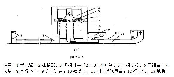 (二)FA006型、FA009型系列往复直行式抓棉机 reciprocated plucker 1、组成:主要由抓棉器2、直行小车8与转塔7等组成。工作特征: 抓棉器沿两条地轨13做往返直行休闲。 抓棉打手3能在直行小车做往返双向行程时抓棉,也能在直行小车单向行程时抓棉。小车走到一端调向时,抓棉器即下降一个抓棉深度,下降量在2~10㎜可调。 棉包可铺放在地轨的两侧,每侧棉包可分成四组,组间约间隔1米。当一侧在进行抓棉时,另一侧面可铺放棉包。如将转塔相对于小车调转180°角,就可在新的一侧继续抓棉生产。 固定输赠管道11位于两地轨之间,由钢板制成。为了适应小车行走输棉的需要,矩形管道的上边敞开采纳一根平带覆盖。覆盖带10一端固定,另一端联结在小车卷绕轮上,随小车的挪移做收放带的动作,使输赠管道的长度随小车位置挪移而变幻。且新铺棉包的高度差异不超出300㎜时,抓棉机能自动将其拉平。 FA006型系列的产量在1200㎏/h以上,可根据开清棉生产线作自动调整。每侧可分2~4组,罗列不同原材料的棉包。工作时作自动分组抓取,FA006C型可实现一台抓棉机同时供应两条开清棉生产线。当不同高度的棉包需要同时生产时,可以分组罗列并由抓棉机在抓取时自动寻平( 即对较高的棉包在肯定次数内增添抓棉罗拉的抓棉深度,直到使其达到正常棉包高度 ),终同时抓尽棉包。但平包过程是往复抓棉机混棉质量的不稳定时期。因平包过程中,某种成分是超量抓取或某种成分的空缺同时存在,棉束开松度也不稳定。 被抓取的棉束经输棉管道,借前方凝棉器或输棉风机产生的气流赠至前方机台。