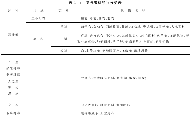 喷气织机织造范围见图2-1。喷气织机布料分类见表2-1。