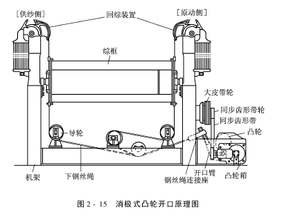 2.凸轮开口 凸轮开口按综框驱动机构的性质可分为消极式与积极式两种。消极式凸轮开口机构由开口凸轮箱、钢丝绳及导轮、归综箱三部分组成。它由归综箱中的归综弹簧操纵综框复位。积极式开口凸轮机构用共轭凸轮驱动综框升降,不需要归综装置。欧洲喷气织机多配置积极式凸轮开口机构,多8页综框。日本机型多配消极式凸轮开口。