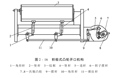 图2-16中,当主凸轮7由小半径转到大半径时通过转子摆杆6、连杆5、摆杆9,推拉杆11、角形杆1与10、竖杆2与4,使综框在其垂直导轨内上升。主、副凸轮为一体件,同转向,同转速。当副凸轮8的小半径转到大半径时,则反之,综框下降。由于整个系统靠两凸轮的共轭精度保证良好的约束条件,所以综框休闲的精度与平稳性较好。连杆5右端在转子摆杆6上的高低位置可调节综框的动程大小。