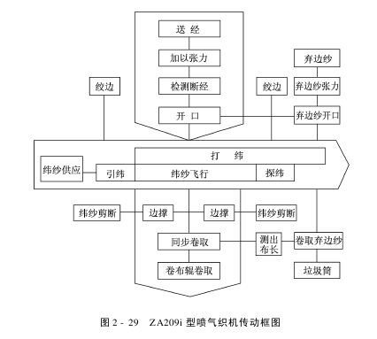 ZA200系列喷气织机传动系统:电动机通过三角带将动力传递给织机主轴,主轴再传递给织机上的各个机构。织机在点动与自动找纬期间的休闲是通过5Hz变频电源驱动主电动机,然后主电动机再将动力传递给织机各个机构。