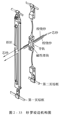 (1)机构的概要:这个装置安装在与第二页综框上。利用与第二页综框的上下休闲带动装置工作,穿在织针上的两根芯纱与穿过磁性滑块上的一对斜长孔中的两根绞缠纱,共四根纱罗纱进行绞边,如图2-33所示。