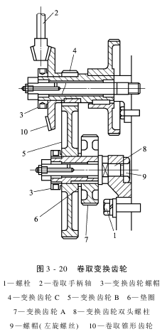 (2)若要变的纬密超出织机的送经变换齿轮所能覆盖的密度范围时,则需将送经变换齿轮和卷取变换齿轮重新组合。 (3)不同规格的A齿轮在卷取手柄轴2上有不同的安装位置,安装时要注意。 3.卷布张力自动调整装置 织机运转过程中,随着卷布辊外径逐渐增大,依靠卷取制动器的打滑作用,使卷布辊转速变慢,从而使织物保持肯定的张力,如图3-21所示。其中,14为防倒转装置,用来预防织机在运转过程中因织物张力过大而引起的卷布辊倒转。通过调整手柄轴2和刹车柄3、扭力调整螺母9及锁紧螺母10可实现卷布张力的自动调整。