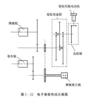 有的喷水织机已经采纳了电子卷取机构。其结构原理如图3-22所示,其主要的特点是卷取机构由一个单独的电动机驱动,同原机械式卷取机构相比大大简化;调节纬密只需改变电动机转速即可;可通过编制织物组织程序,实时操纵卷取电动机转速,织造变纬密织物;和电子送经联动,由织机电控系统统一操纵,使织轴和卷布辊同步工作,相互匹配,用来去除由于经纱张力变化而造成的开车稀、密档,云织等织疵,提高织物质量,便于操作。