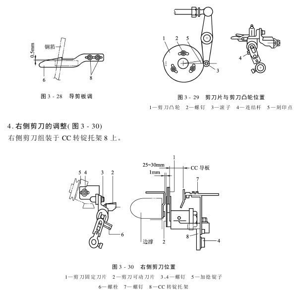 ①将时位轮的位置置于0°(钢筘移至前方位置)。 ②剪刀刀片的尖端伸出钢筘2mm,并用螺栓4固定。 (3)导剪板(图3-28): ①将导剪板6的凹部调整为比固定刀片1的上面高出0.5mm,暂以螺帽8固定。 ②将钢筘9摆至前面,使导剪板6的沟处于如图3-28的状态,然后旋紧螺帽8而固定导剪板6。 (4)剪刀的高度(图3-27):以螺钉5将导剪板6的各部上面调整为和径丝面高度一致。 (5)剪刀片的重叠和剪刀凸轮的关系(图3-29): ①用手转动织机将时位轮转至40°位置。 ②将3只螺钉2松开,使剪刀凸轮1的中心刻印5和凸轮滚子3会合,然后将3只螺钉2旋紧而固定剪刀凸轮。 ③剪刀片的尖端将重叠1mm,以剪刀连结杆4调整(此状态的剪丝时位约在10°位置)。
