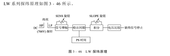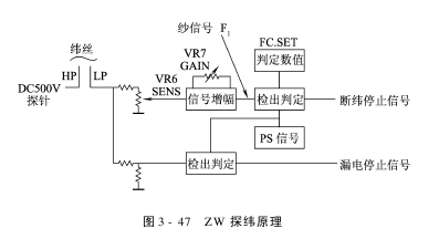(1)触指式探纬原理:织机运转时,水流及含水的纬丝和探针接触,由于水的导电性,使肯定的电流由高压侧探针流向低压侧探针,从而使探纬器信号处理单元接收到所需的纬丝信号。这里接收到的信号包含:纬丝信号、水信号、纬尾信号及漏电信号。探纬信号处理单元就是将此混合信号加以处理,滤去无用信号,保留并放大纬丝信号。信号处理单元利用PS信号进行时段操纵,将放大整形后的探纬信号进行计数比较,然后输出工作指令。探纬接收到的波形如图3-45所示。