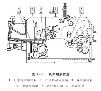 主要集中于左右主传动齿轮箱,送经蜗轮箱,卷取齿轮箱等部位,具体加油位置如图3-61所示。加油内容见表3-6。