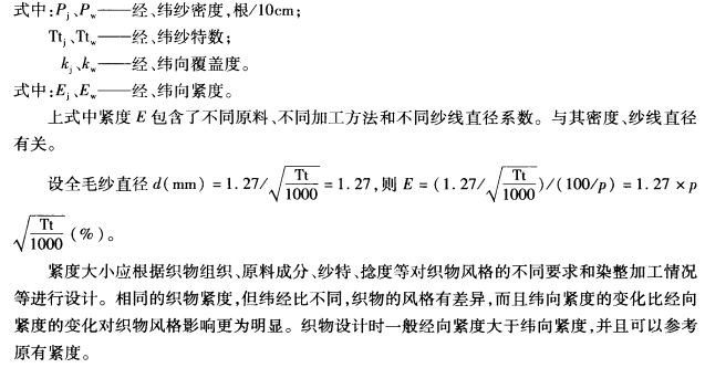 织物的紧度表示织物的紧密程度。它表示织物中纺纱线投影面积和其对应的织物面积的百分率。经纱的投影面积所覆盖的百分率称经紧度(经覆盖率),纬纱投影面积所覆盖的百分率称纬紧度(纬覆盖率)。