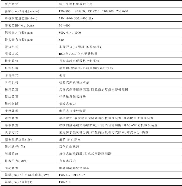 JW800型系列喷水织机是引春机械股份有限公司(中国台湾省)于1997年在浙江省萧山市国家经济技术开发区独资建设的杭州引春机械有限公司生产的系列型喷水织机。 适织品种 适用于织造各种人造纤维,合成纤维为原材料的疏水性织物。合成纤维织物中包含复丝,加捻丝和免浆用丝,织物重量范围为40~500g/m 。纬丝范围33~990dtex(30~900旦)。双泵双喷机可适合两根纤度差异较大的织造。 结构型式 箱型墙板,异型钢管加强型横梁,构架稳固,振动小。 开口装置 曲柄四连杆开口装置可织造平纹织物(多8页综框)。可配备积极式凸轮开口装置(多10页综框),可配备多臂开口(多16页综框)。 引纬装置 采纳高压 水泵或双水泵,新型环状喷嘴,射流的集中性强。 打纬装置 采纳短牵手双侧驱动多筘座脚四连杆打纬系统,轻量化打纬轴,减小机械振动。 送经装置 采纳重锤调节张力变化,无级调速的送经机构,经纱张力变化平稳,上机张力调节范围广,调整方便,不需其他装置进行补偿。 卷取装置 机械式连续间接卷取,张力自动调节机构,采纳杆式防卷皱装置,卷取张力适当,可加装ASP预防停车档装置。 测长装置 机械式采纳鼓式测长方式,电子测长装置采纳ROJ、LGL电子测长。 操纵系统 全套采纳日本北越电研的微机操纵系统,动作精确,故障少,可靠性强。 润滑系统 主传动为箱式油浴润滑,其它为润滑脂润滑。 型号示意: