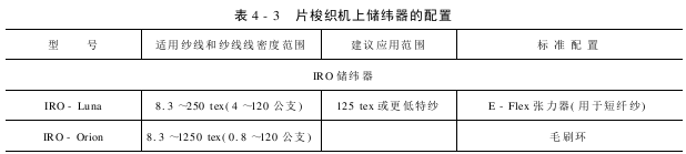 梳形制动器配备有三种不同的节距,供纬纱选用: 13mm节距:用于特数大于1000dtex的多纤维合成长丝,或者直径小于0.15mm的合纤单丝。 15mm节距:用于聚丙烯裂膜条PP。 18mm节距:用于表面PU涂层的多纤维合成长丝,或者直径大于0.15mm的合成单丝。 其它,15mm节距和18mm节距的梳形制动器要用功率较大的步进电动机操纵,根据纬纱的种类特点,梳形制动器仅需更换顶部的梳形导纱架。 (3)弹簧片制动器制动装置:弹簧片制动器制动装置是靠两弹簧片对纬纱的夹持力来制动的。这种制动装置主要用于特别细支的毛纱。它的特点是:制动作用柔和和缓,制动片柔顺灵敏,故可有效降低纬纱断头率。此型制动器不要求纬纱预先被张紧,即从储纬器输出的纬纱其张力可调节到小状态。 6.储纬器 随着片梭织机引纬速度的提高,储纬器已经成为必不可少的保证纬纱顺利地从筒子上退绕和引入梭口的工具。表4-3是P7300型片梭织机上储纬器的配置。
