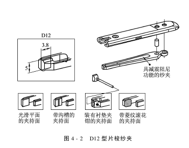 (1)片梭6开始从输送链13送往引纬的位置:这时梭夹钳口逐渐张开,并向握持着纬纱头的递纬夹1靠近。同时张力平衡杆2位于高位置使纬纱张紧,压纱器3则压紧纬纱。 (2)片梭6到达引纬位置:这时张开的梭夹钳口对准递纬夹的钳口。张力平衡杆2和压纱器3保持上述状态。 (3)完成把纬纱从递纬夹转交给梭夹的交接过程:这时梭夹钳口闭合,握住纬纱,递纬纱的钳口则张开,即完成了纬纱的交换过程。同时,片梭6已做好向梭口飞行的打算,压纱器3则开始上升,而张力平衡杆2则开始下降。 (4)投梭:握持纺纱线的片梭从引纬侧飞经梭口到达制梭侧。这时纬纱从储纬器4上退绕下来(5、7、8为导纱器)。压纱器3升到高位置以解除对纬纱的制动,张力平衡杆2则降到水平位置。 (5)制梭及片梭回退:片梭6在制梭侧被制动后,依靠片梭回退器(图中未画出),将片梭推回到靠近布边处。这一动作的目的是为了使钩入布边的纬纱头的长度操纵在低限度内(1.2~1.5cm)。这时压纱器3大限度地压紧纬纱,张力平衡杆2则略为上升,这样,就可以使由于片梭的回退而松弛的纬纱(在梭口中)被张紧到适当程度。同时递纬夹1移动到靠近布边处,递纬夹钳口开始第二次张开。 (6)递纬纱打算夹纱:这时,定中心器11向纬纱靠近,并将纬纱推入张开的递纬夹钳口中。两侧边纱钳9则在靠近布边处将纬纱夹住。张开的剪刀10上升到纬纱处并打算切断纬纱,压纱器3和张力平衡杆2仍保持同上位置。 (7)递纬夹完成夹纱动作:这时,递纱夹1的钳口第二次闭合并夹持纬纱。张开的剪刀10上升到纬纱年并打算切断纬纱,压纱器3和张力平衡杆2仍保持同上位置。 (8)剪纬:这时,剪刀10在引纬侧将递纬夹1和边纱钳9之间切断,在制梭侧的片梭的梭夹钳口再次被打开,纬纱头从钳口中脱出,这样梭口中的纬纱就被两侧的边纱钳9所持。和此同时,在制梭侧的片梭则被推入输送链13,再由输送链向引纬侧回送。 (9)递纬夹开始向纬纱交接位置移动:这时,递纬夹1握持着纬纱向左侧移动。压纱器3仍对纬纱制动,张力平衡杆2则继续上升,并张紧由于递纬夹外移而松弛的纬纱。两只边纱钳9和钢筘同时移向织口,将纬纱打入织口,而在布边两侧的纬纱头仍被边纱钳所握持。这时,剪刀10下降。 (10)递纬夹回复到纬纱交接位置:这时,递纬夹1再次回到左侧位置,即和梭夹发生纬纱交接的位置。张力平衡杆2上升到高位置,使纬纱保持张紧,由边纱钳9所夹持的纬纱头则被左右两只钩边针12钩入梭口中,形成布边。和此同时,在引纬侧又有一只片梭开始从输送链13送向引纬位置。 片梭织机的引纬系统包含片梭、片梭的引导、片梭纱夹、纬纱张力杆,单色、二色、四色、六色引纬机构、电子操纵的纬纱制动装置、储纬器、电子操纵的片梭制动、开梭装置(接梭侧)和压梭装置等。 1.筘座中的导梭齿采纳高精度、小形体的导梭齿。为了提高织物的品质,采纳分别错开式排列的导梭齿模块,这样减少了经纱所受张力的影响,纬纱出口增大,受到的摩擦也相应地减少。对于单片整只导梭齿主要应用于某些非常品种的织造。 2.片梭 片梭有以下三种类型:D1型小横断面的钢质片梭;D2型大横断面的钢质片梭;D12型小横断面及大钳夹面的钢质片梭;K2型大横断面的合成片梭。 P7300型片梭织机配有:D12型和D2型钢质片梭。D12型片梭的纬纱夹持面为3.8mm×5mm。梭体尺寸:长89mm,宽14.3mm,高6.35mm。由于梭体两面平行,梭壳内的纱夹采纳的钢销固定,因而更换纱夹特别简单且方便。 D2型片梭,片梭体积增大,重量增加30%,纱夹的纬纱夹持面为4mm×5mm,主要用于非常粗的纬纱和宽幅织机。梭体尺寸:长89mm,宽15.8mm,高8.5mm。纱夹的夹持力为600~3500g。 3.D12型片梭纱夹 D12型片梭纱夹具有减震阻尼功能,纱夹的夹持面有完滑平面的夹持面,带沟槽的夹持面,装有衬垫夹钳的夹持面,带有菱纹滚花的夹持面。如图4-2所示。