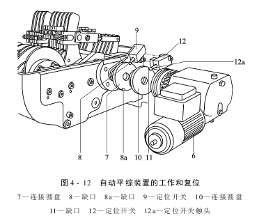 插件上的开关手柄2(KFW)及开关手柄3(SFW)不同的位置可以取得不同的操作状态:开关手柄2(KFW)及开关手柄3(SFW)都在“OFF”位置,则自动平综装置不起作用。开关手柄2(SFW)在“ON”位置,则经纱断头后,自动平综装置使梭口自动提升。开关手柄3(KFW)在“ON”位置,则纬纱断头后,自动平综装置使梭口自动提升。自动平综装置的工作和复位过程,如图4-12所示。