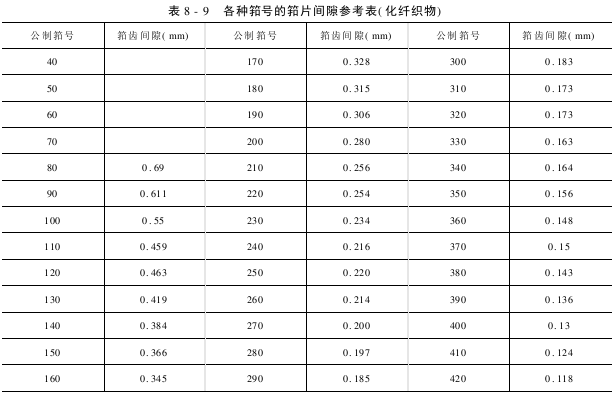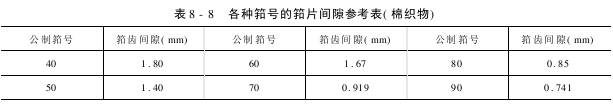 合适的筘隙对于喷气织机效率及织物的质量是非常必要的,推荐的筘隙仅能作为参考,适合的筘隙只能通过实践经验,对纱线织物的种类全面熟知才能完全达到。表8-8、表8-9是棉织物、化纤织物各种筘号的筘片间隙参考表。