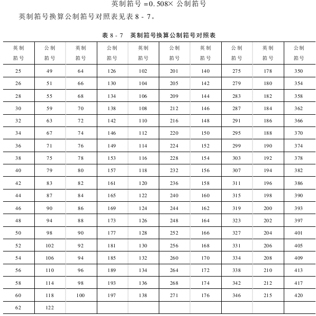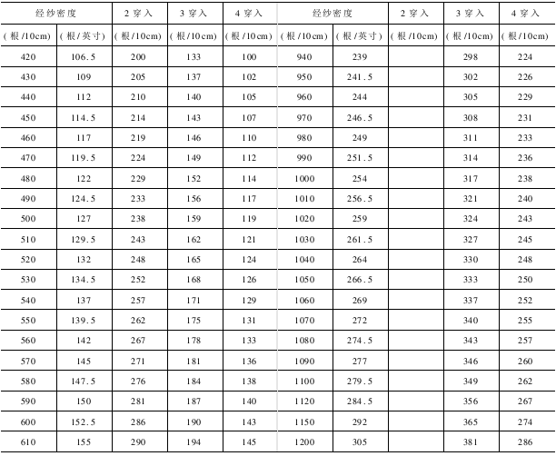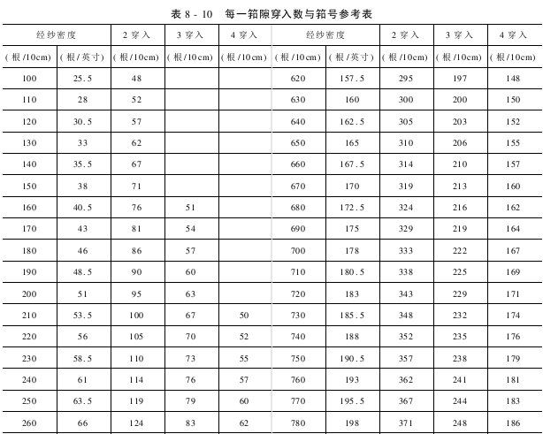织物在试织时,可根据经纱密度参考表预选用筘号。经试织后,适度调整后决定正式使用的筘号,表8-10适用于地经组织每一筘隙穿入2,3,4根的筘号。