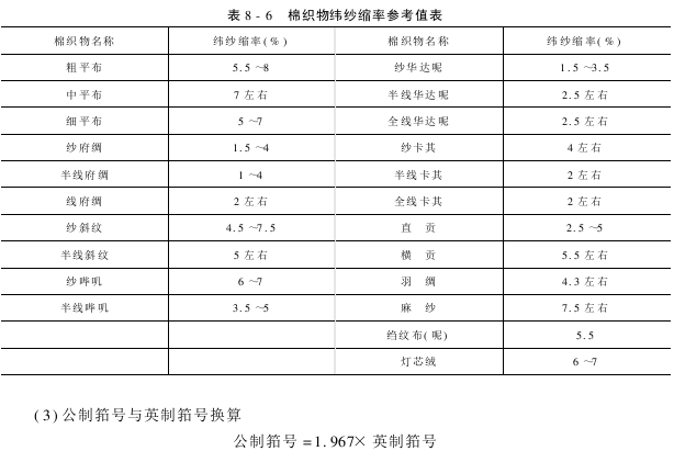 (1)公制筘号的选用:公制筘号可按下式计算,一般取整数,筘号范围50~330筘/10cm,化纤70~400筘/10cm。