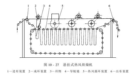 (2)热风烘燥机:热风烘燥机是借热空气传热给干燥布料以消除水分。根据布料在烘房内的状态不同,热风烘燥机有悬挂式、圆网式、气垫式等多种形式。
