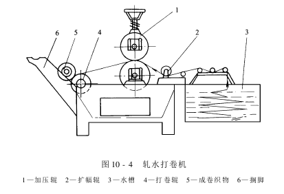 ②轧水打卷:轧水打卷机由水槽、扩幅辊、轧水辊与传动装置等组成,见图10-4。轧水是在平幅轧水机上进行的。操作时两辊自然接触,面料需预先缝接好,依次无压地浸在清水池内,然后平坦无皱地通过轧点被卷在卷布轴上,桑蚕丝薄布料普通不加压水辊,预防坯绸产生松紧,经轧水机后造成压刹印疵病。所以,轧水工艺实为打卷。较厚的布料等可加压水辊,普通用于纺类、斜纹类、缎类面料。它可以预防皱印,但简单产生卷边与皱条等疵病。